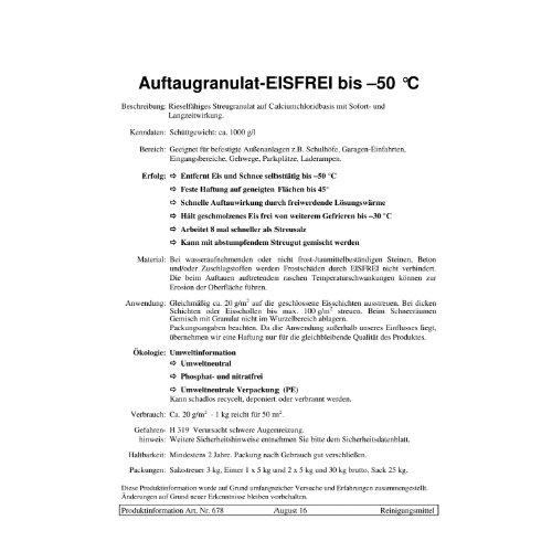 - Zur schnellen und effektiven Entfernung von Eis und Schnee bis -50°C auf befestigten Außenanlagen, z.B. Gehwegen, Einfahrten, Parkplätzen