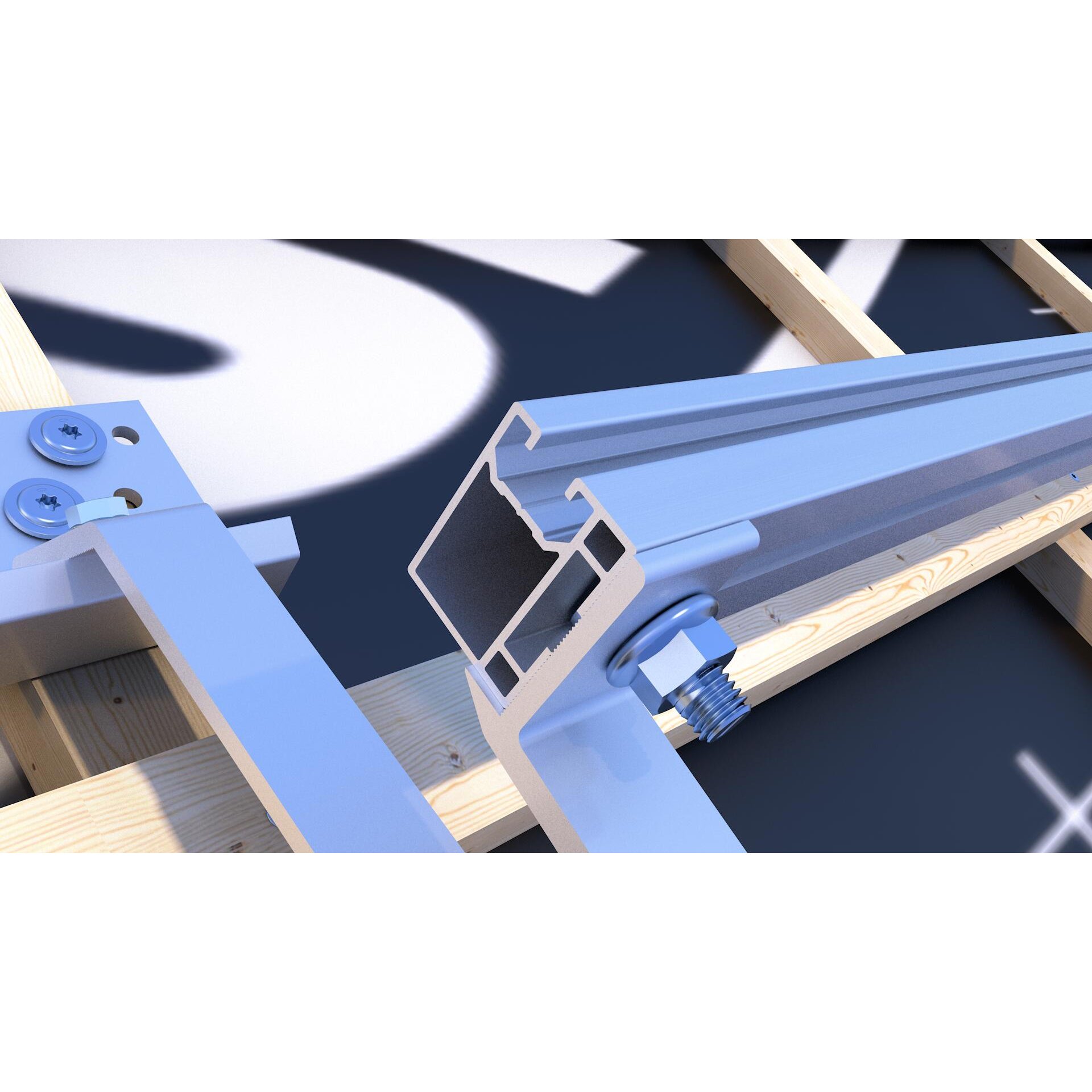 - Die Montageschiene Steildach kann mithilfe der Hammerkopfschraube und einer Sperrzahnmutter unkompliziert an den Dachhaken montiert werden.