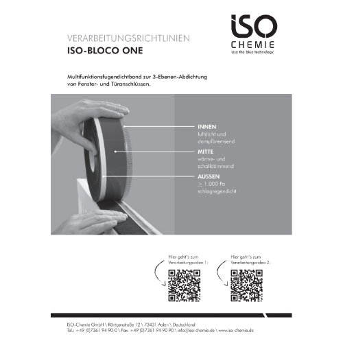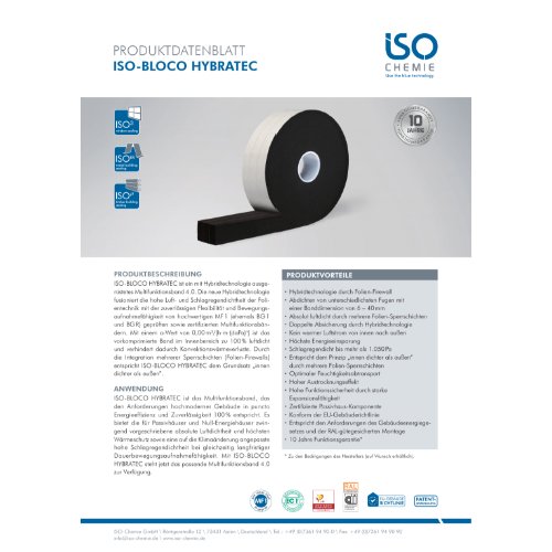 ISO-BLOCO HYBRATEC ist ein mit Hybridtechnologie ausgerüstetes Multifunktionsband 4.0. Die neue Hybridtechnologie fusioniert die hohe Luft- und Schlagregendichtheit der Folientechnik mit der zuverlässigen Flexibilität und Bewegungsaufnahmefähigkeit von hochwertigen MF 1 (ehemals BG 1 und BG R) geprüften sowie zertifizierten Multifunktionsbändern. Mit einem a-Wert von 0,00 m³/[h·m·(daPa)n] ist das vorkomprimierte Band im Innenbereich zu 100 % luftdicht und verhindert dadurch Konvektionswärmeverluste. Durch die Integration mehrerer Sperrschichten (Folien-Firewalls) entspricht ISO-BLOCO HYBRATEC dem Grundsatz „innen dichter als außen”