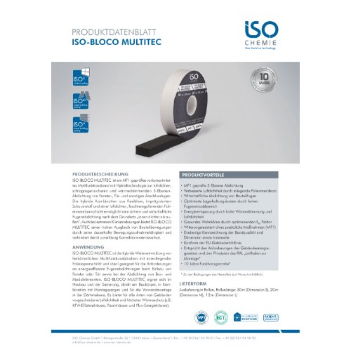 - ISO-BLOCO MULTITEC ist die hybride Weiterentwicklung von herkömmlichen Multifunktionsbändern mit innenliegender Foliensperrschicht und ideal geeignet für die Anforderungen an energieeffizente Fugenabdichtungen beim Einbau von Fenster oder Tür sowie bei der Abdichtung von Bau- und Modulelementen.