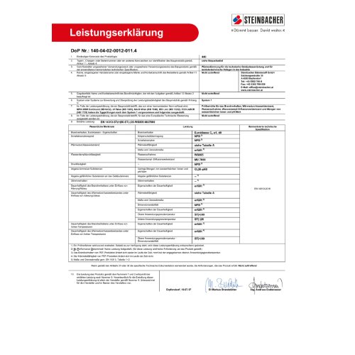 - Baustoffklasse gem. DIN EN 13501-1: Euroklasse C (s1, d0),