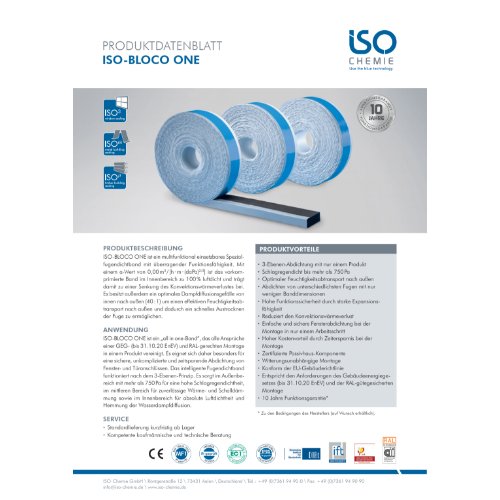 ISO-BLOCO ONE ist ein multifunktional einsetzbares Spezialfugenband, welches die 3-Ebenen Abdichtung (Fensterbau) in nur einem Produkt vereint. Dabei ist das Multifunktionsband im Innenbereich luftdicht, füllt die Dämmebene vollständig aus und ist nach außen hin diffusionsoffen und schlagregendicht (≥ 750 Pa)