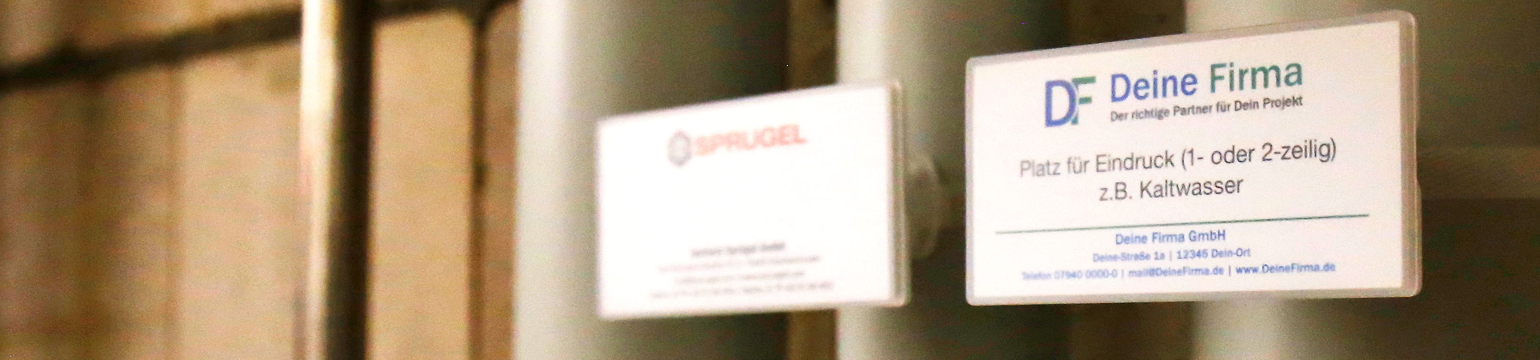 Sie erhalten von uns eine passende Vorlage, in der Sie die Beschriftung (Warmwasser, Kühlwasser Rücklauf...) vornehmen und anschließend in die Vordrucke eindrucken. Jetzt nur noch die Sebsycards beim Kunden anbringen und dauerhaft präsent sein!