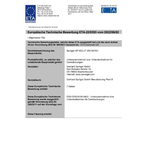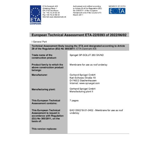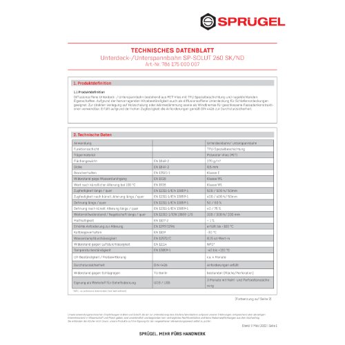 SP-SOLUT 260 SK/ND ist eine diffusionsoffene Unterdeck- / Unterspannbahn bestehend aus PET Vlies mit TPU Spezialbeschichtung und nageldichtenden Eigenschaften. Zur direkten Verlegung auf Holzschalung oder Wärmedämmung, als Windbremse für geschlossene Fassadenkonstruktionen und aufgrund der hervorragenden Hitzebeständigkeit auch als diffusionsoffene Unterdeckung für Schiefervordeckungen geeignet. Erfüllt aufgrund der hohen Zugfestigkeit die Anforderungen gemäß DIN 4426 zur Durchsturzsicherheit und entspricht der ZVDH-Produktdatenblatt Klasse UDB-A / USB-A.